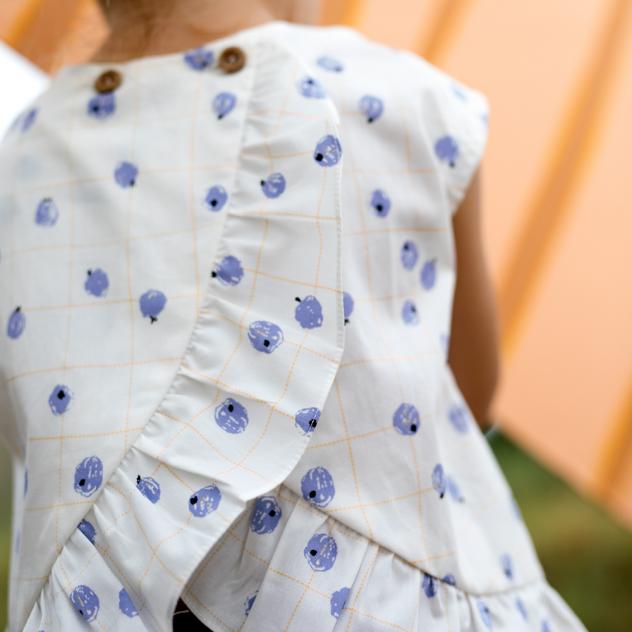 Popeline met opdruk van bosbessen op een witte ondergrond met een licht oranje raster.