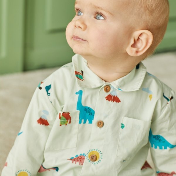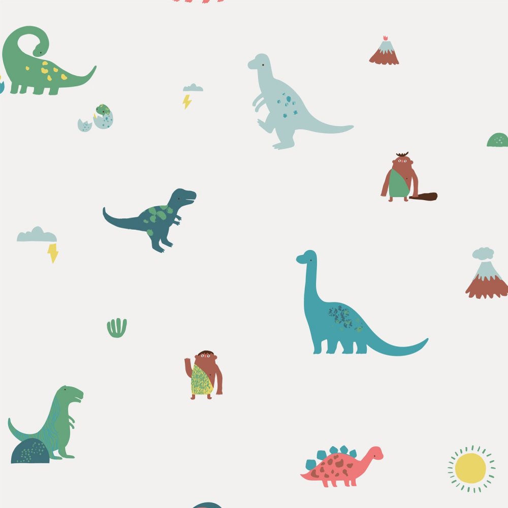 Popeline stof met grappige dino's en holbewoners op een beige ondergrond. Ideaal voor het naaien van babykleding zoals hemdjes en accessoires.