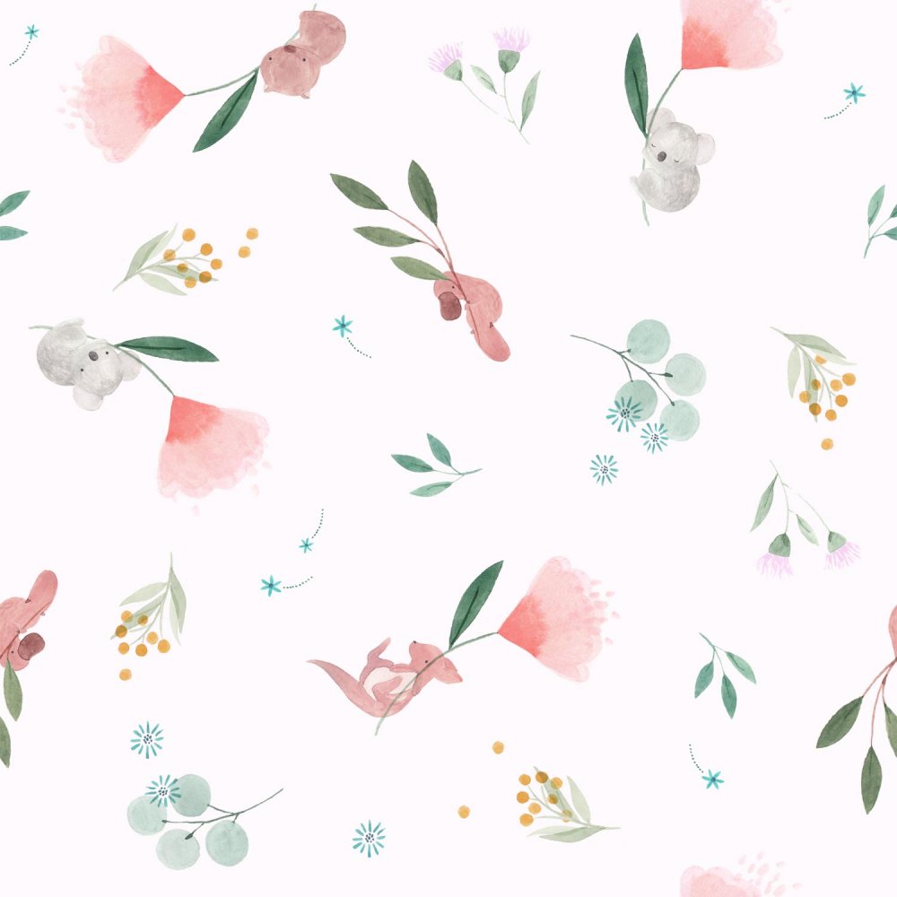 Katoenen stof met opdruk van koala's, kangoeroes en vogelbekdieren die zich vasthouden aan in de lucht zwevende takjes en bloemen, op een poederroze ondergrond.