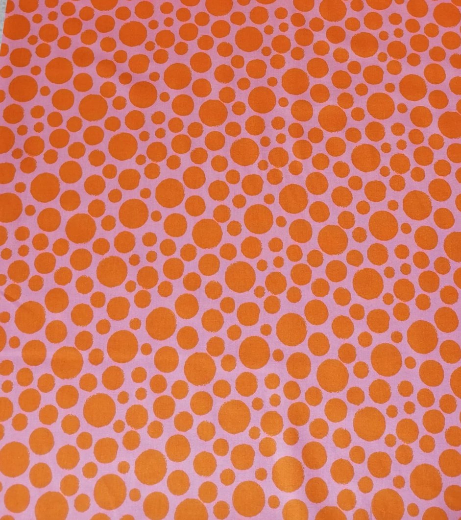 Mooie 100% katoenen stof met oranje stippen op een roze achtergrond.