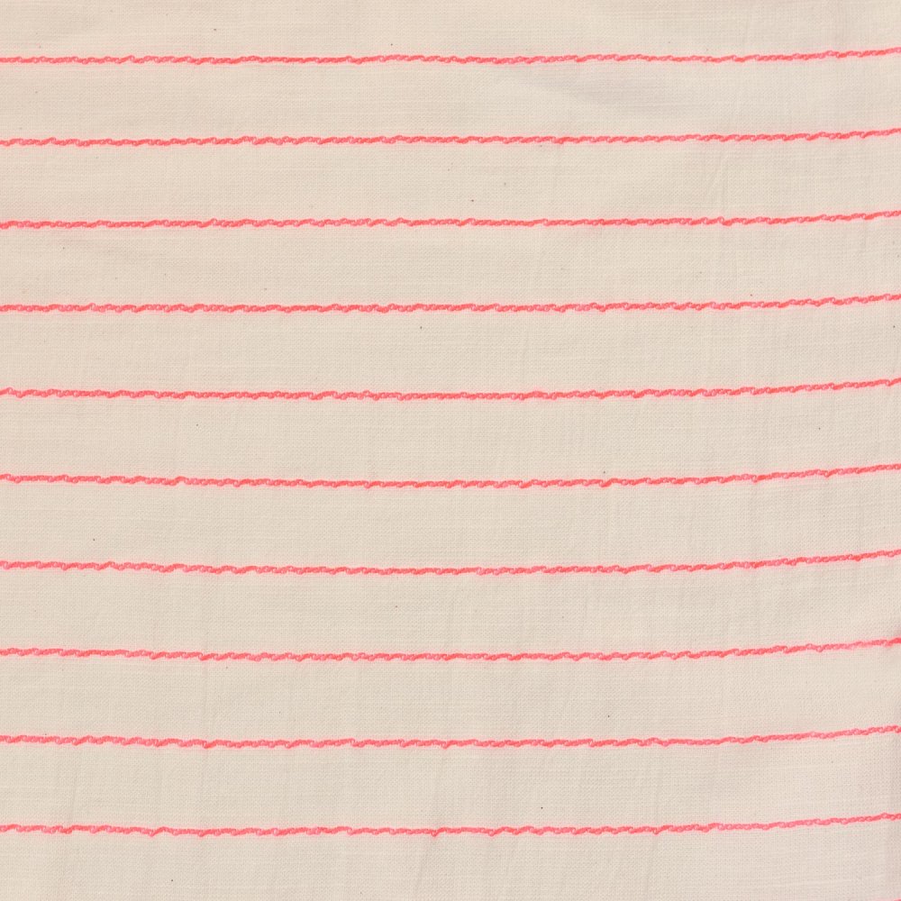 Sari fluor is een zacht ecru kleurig katoen met een fluorkleurige draad. Het is een veelzijdige en koele stof voor het naaien van alle soorten zomerse kleding en accessoires.