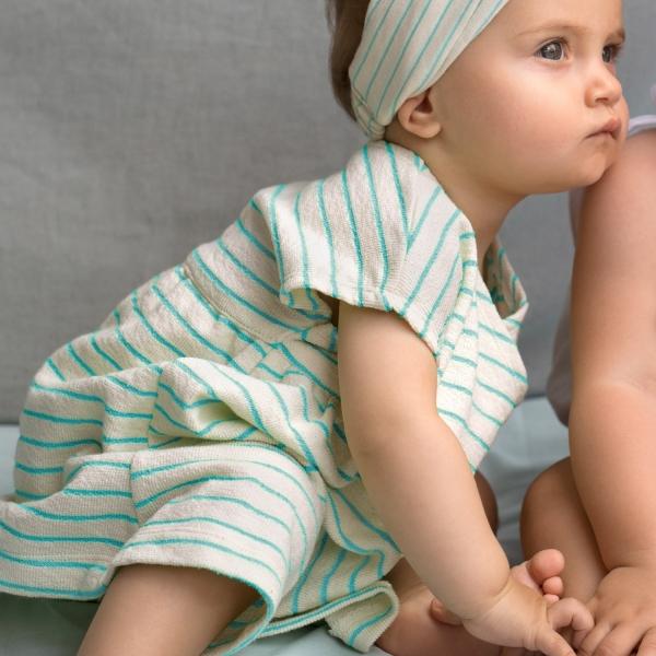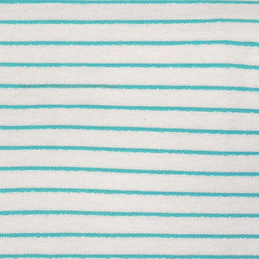 Stripes Aqua is een zomerse ecru kleurige stof met een neon blauw streepje en heeft een leuk badstofeffect.