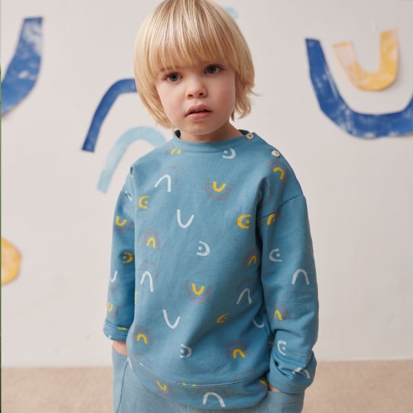 Winterse sweatstof met een zeer zachte binnen en buitenkant. De stof heeft een blauwe ondergrond met vrolijke regenbogen in geel, grijs en lichtblauw.