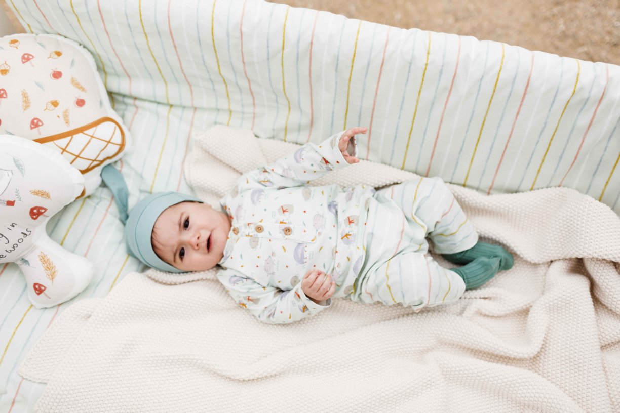 Jersey stof met opdruk van wazige lijnen op een pastelgroene ondergrond. Ideaal voor het naaien van comfortabele kleding voor baby's en kinderen.